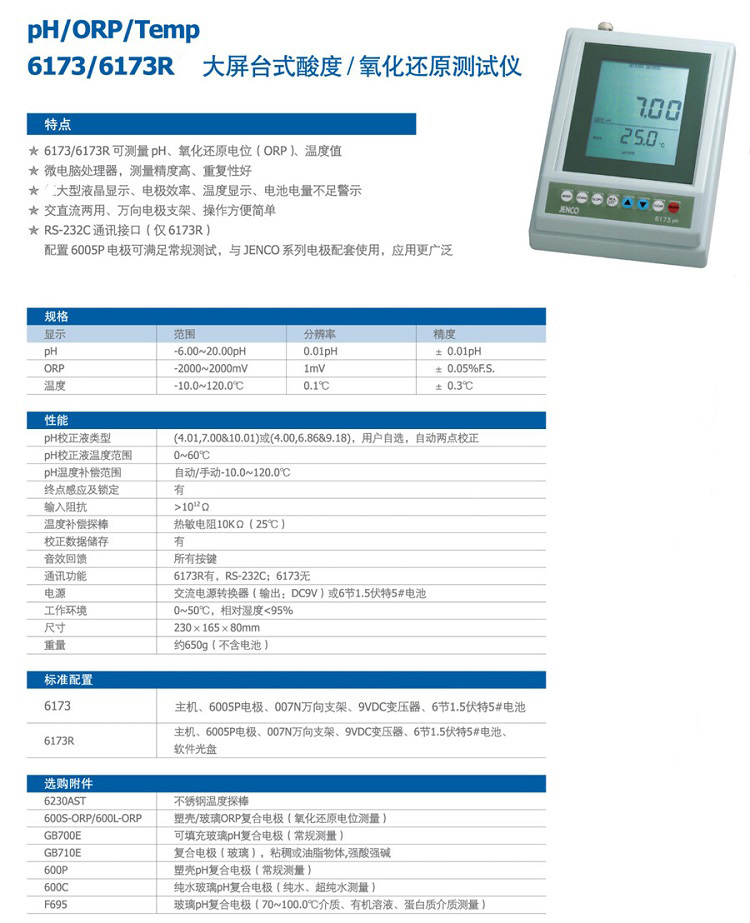 JENCO/任氏6173R臺式電腦型PH/ORP計 便攜酸堿度計/mV/溫度計儀