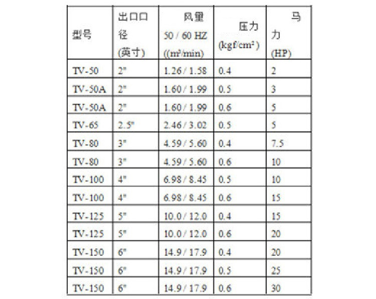 六.春鼎TV型直立式羅茨風機產(chǎn)品規(guī)格: 壓送用途適用壓力∶0 ~ 0.6 kgf/cm2 2 ~ 30HP另外可依特殊材質(zhì)指定設(shè)計TV型直立式羅茨鼓風機產(chǎn)品特性較低的能源損耗∶春鼎TV型直立式羅茨鼓風機的設(shè)計能減少逆流對轉(zhuǎn)子的壓力, 相對也能減少對能源的損耗。較低的噪音∶壓力脈沖是主要的噪音源,春鼎直立式羅茨鼓風機相較于皮帶式羅茨鼓風機能有效降低噪音達五分貝。減免經(jīng)常性之保養(yǎng)困擾∶春鼎直立式羅茨鼓風機采用直結(jié)式傳動,可減免皮帶之經(jīng)常性損耗保養(yǎng)及機氣漏油之困擾。機器體積小,不占空間∶春鼎直立式羅茨鼓風機體積小,不占空間,而出氣口可依現(xiàn)場環(huán)境調(diào)整方向,安裝容易。裝置簡單∶裝置簡單、省工時、不占空間、不需隔音設(shè)備┅┅即達成低噪音之生活空間