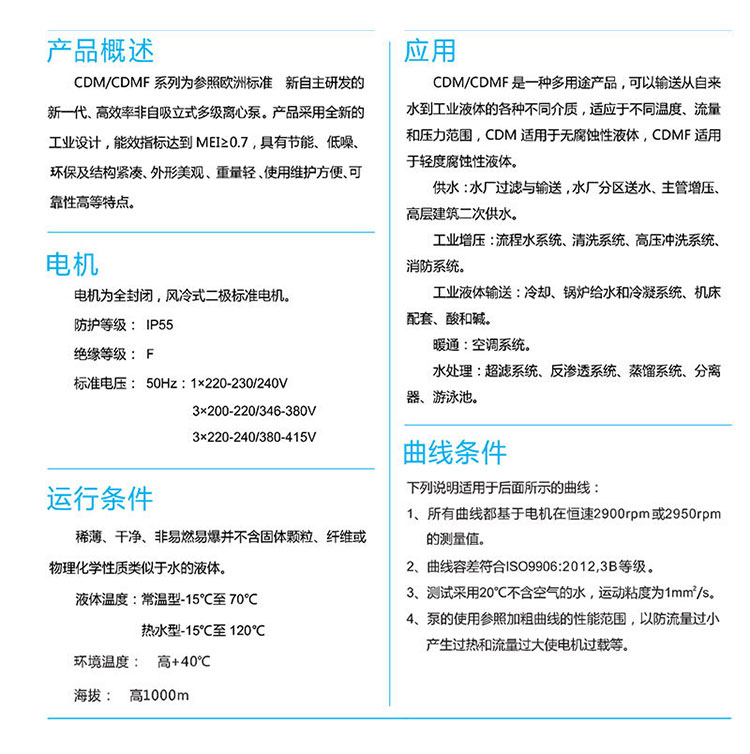 南方CDM/CDMF系列為參照歐洲標準新自主研發(fā)的新一代、高效率非自吸立式多級離心泵。產(chǎn)品采用全新的工業(yè)設(shè)計,能效指標達到MEI≥0.7,具有節(jié)能、低噪、環(huán)保及機構(gòu)緊湊、外觀美觀、重量輕、使用維護方便、可靠性高等特點。
