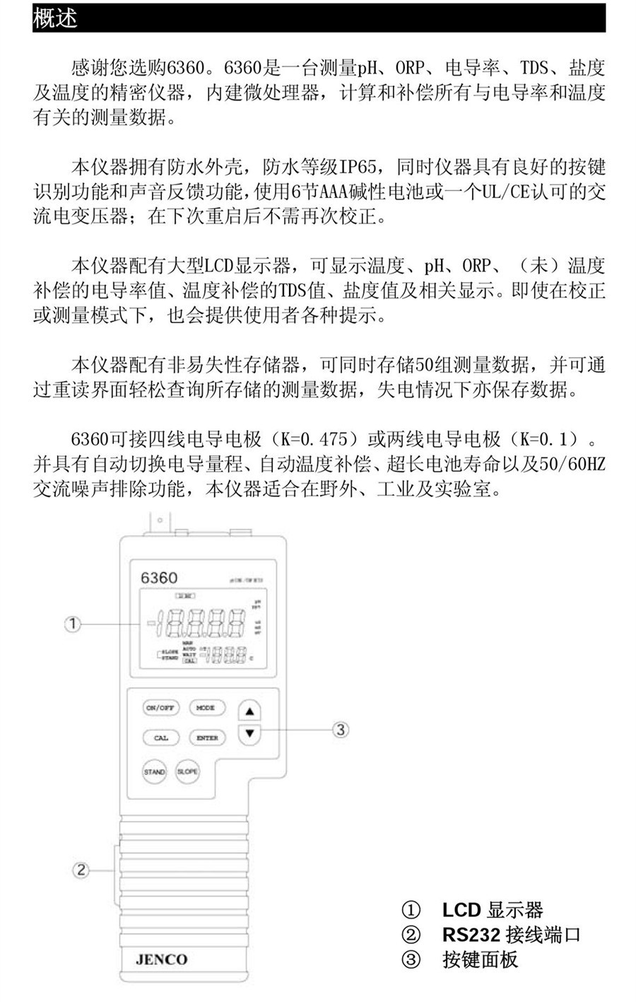 6360為手提式pH/CON/SAL/mV/TEMP.檢測(cè)儀,具防水外殼、RS-232C界面,供儀器與各個(gè)IBM兼容PC連結(jié)。本儀器pH分辨率與mV范圍為0.1,鹽度范圍為0.0至80.0ppt(分辨率0.0ppt)??蛇x擇性導(dǎo)電電池(K=1.0 or K=5.0)與其范圍為(uS或mS.)。