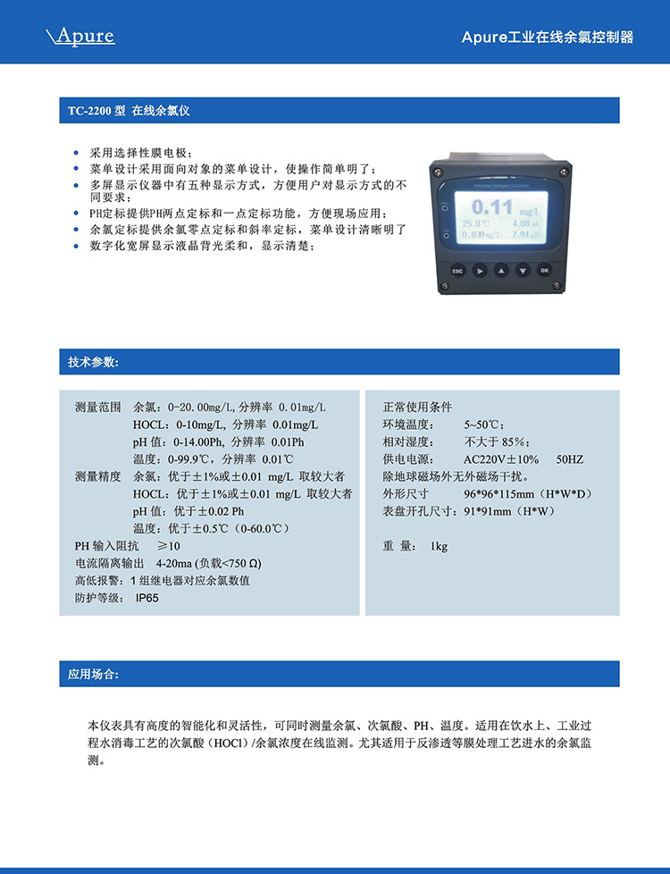 Apure余氯儀TC-2200標(biāo)配工程在線極譜式余氯溫度PH測(cè)量控制器