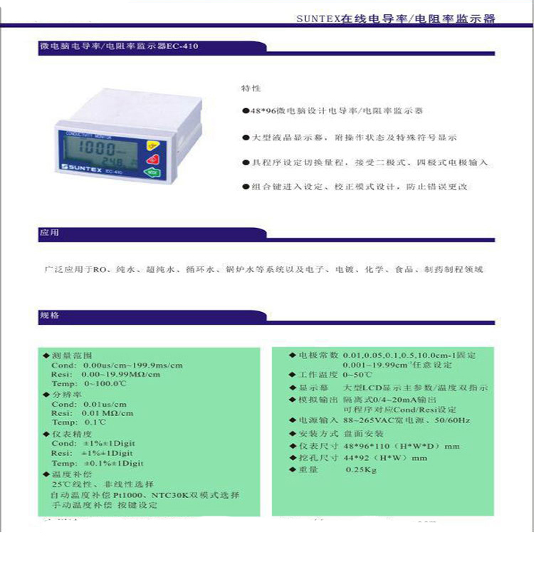 SUNTEX電導率儀EC-410水質(zhì)監(jiān)測電導率控制儀電阻率變送器