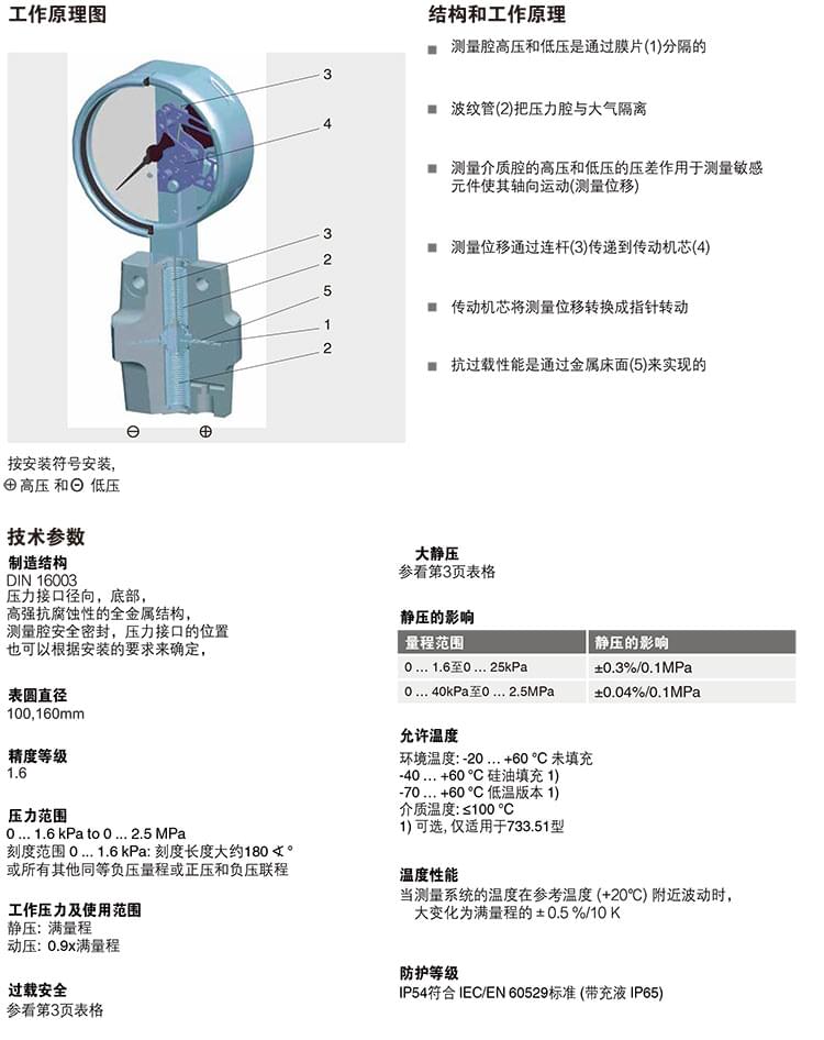 這些差壓表由高度耐腐蝕的不銹鋼制成,全金屬、全焊接的測量腔可確保長期密封性(沒有彈性密封件)。