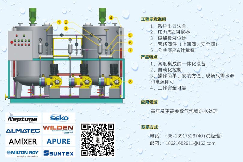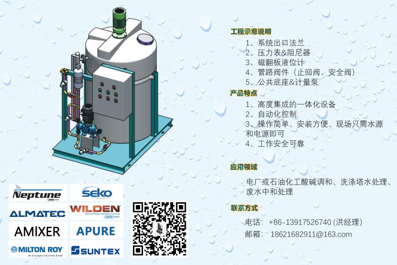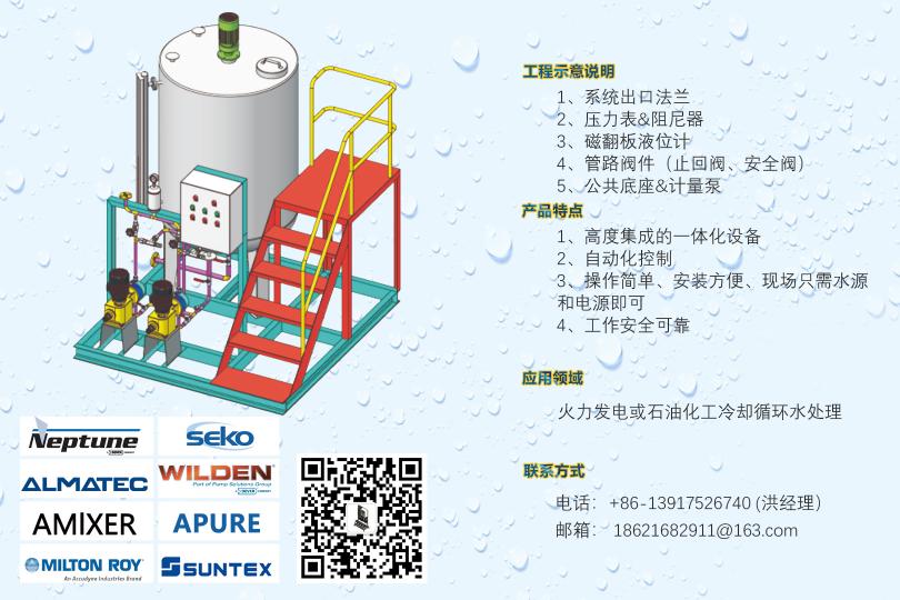 循環(huán)水加藥裝置,示蹤劑加藥裝置,遠程控制DCS加藥裝置,PAC加藥裝置,PAM加藥裝置,酸堿中和加藥裝置,冷卻塔加藥裝置,干粉投加裝置,高分子自動泡藥機,PAM自動制備系統(tǒng),絮凝劑制備系統(tǒng),PAC自動溶解混合配制裝置,純水反滲透裝置,軟化水系統(tǒng),過濾系統(tǒng),遠程控制系統(tǒng),安全閥,背壓閥,流量校正柱,管道式流量計等。