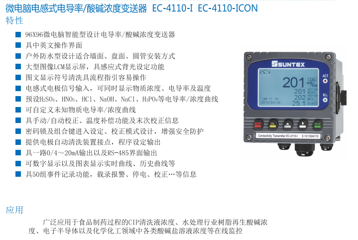 SUNTEX 微電腦電感式電導(dǎo)率/酸堿濃度變送器EC-4110-I  EC-4110-ICON